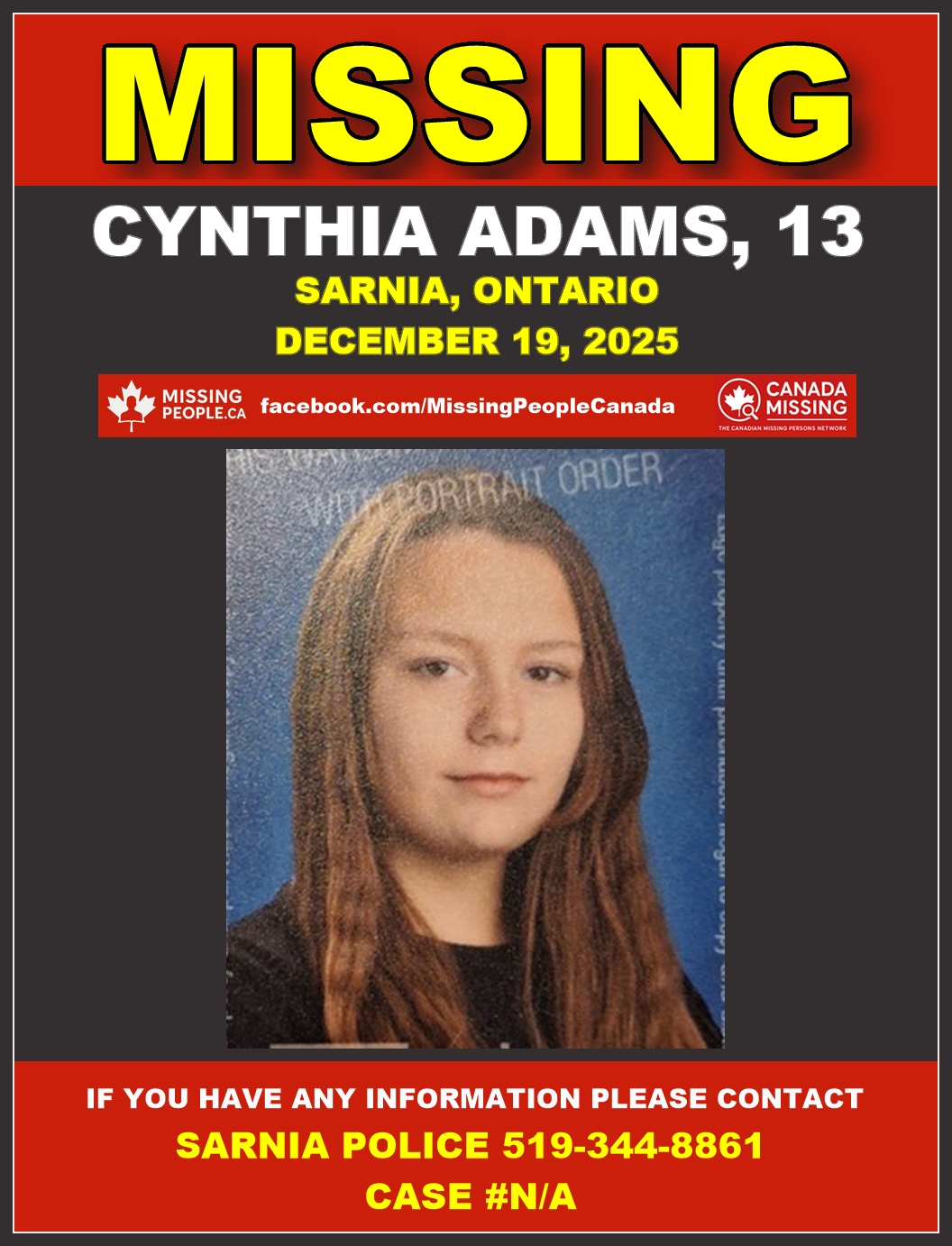 🚨 Missing Female Teen in Sarnia, Ontario – Cynthia Adams, 13 – Last Seen December 19 2025