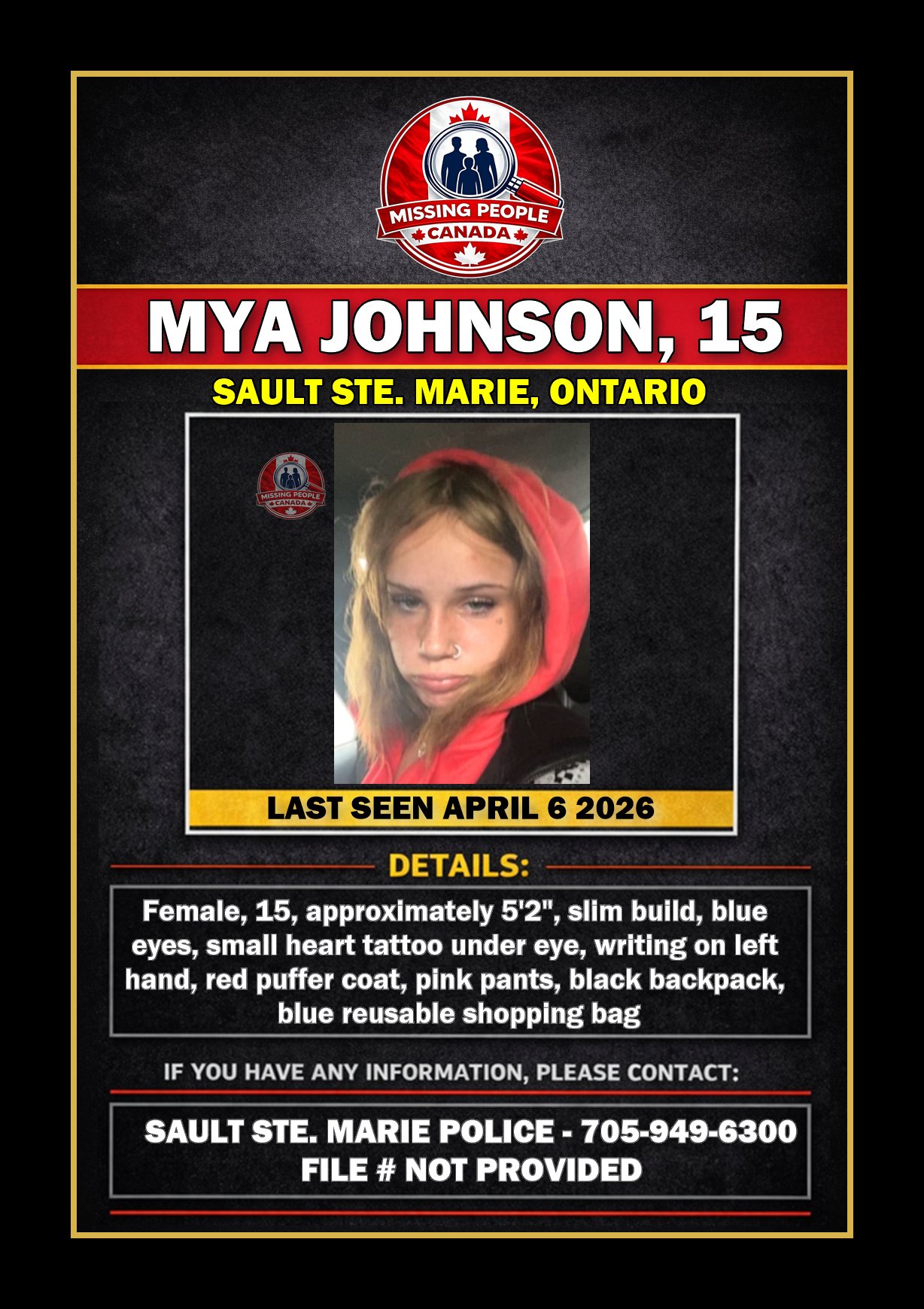 MISSING TEEN IN SAULT STE. MARIE, ONTARIO – MYA JOHNSON, 15 – LAST SEEN APRIL 6 2026