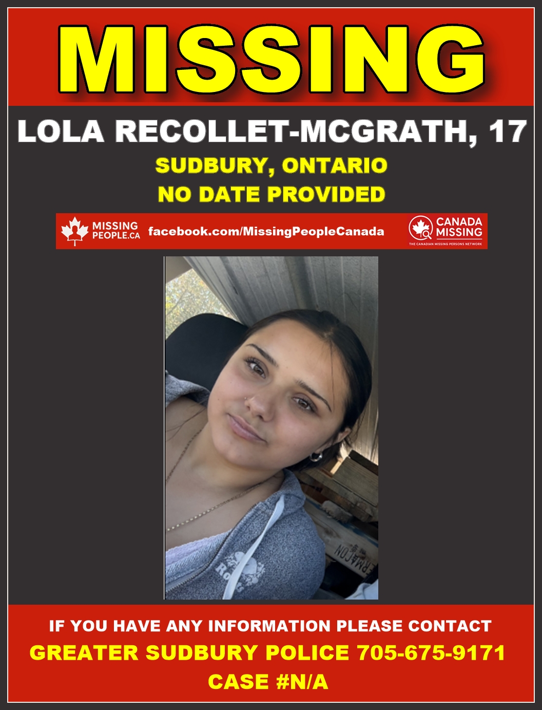 The Greater Sudbury Police Service (GSPS) is seeking the public’s assistance in locating Lola Recollet-McGrath, a 17-year-old female from Sudbury, Ontario.