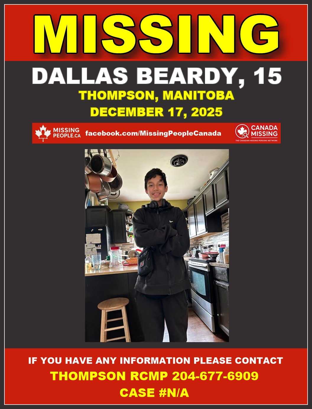 🚨 Missing Male Teen in Thompson, Manitoba – Dallas Beardy, 15 – Last Seen December 17 2025