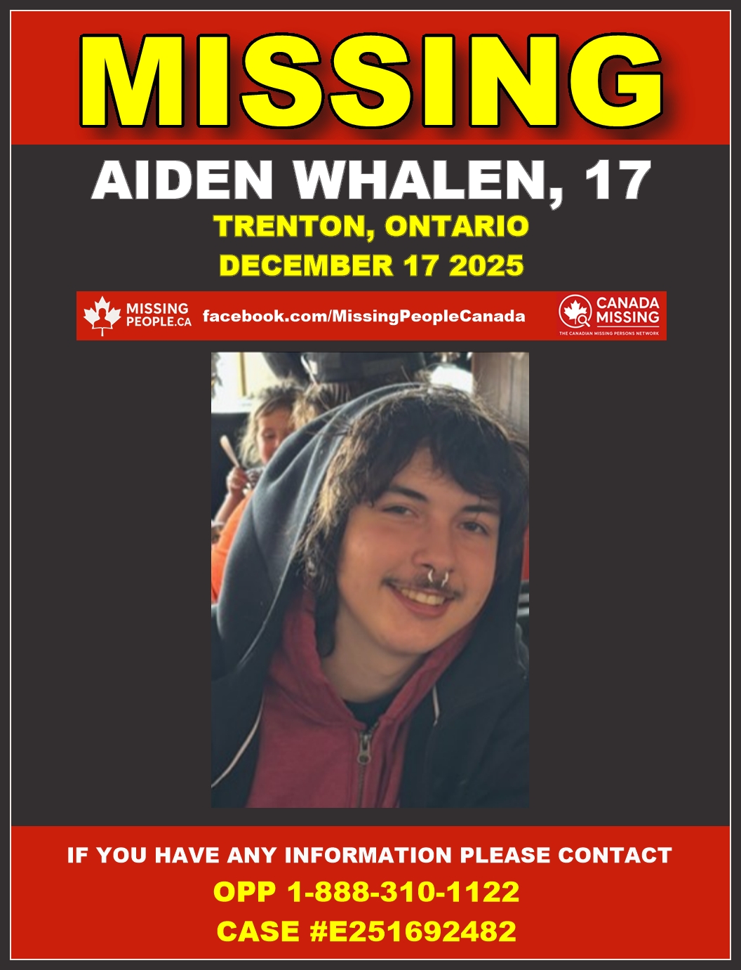🚨 Missing Male Teen in Trenton, Ontario – Aiden Whalen, 17 – Last Seen December 17 2025