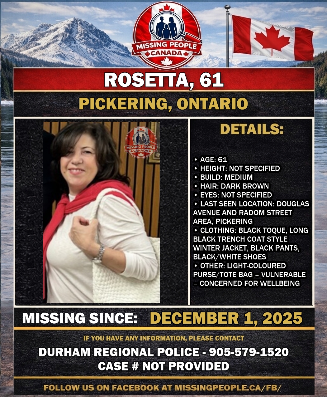 The Durham Regional Police Service is requesting the public’s assistance in locating a missing vulnerable 61-year-old woman, Rosetta. Rosetta was last seen on Monday, December 1, 2025, at approximately 1:00 p.m., in the area of Douglas Avenue and Radom Street in Pickering. Police are concerned for her wellbeing.