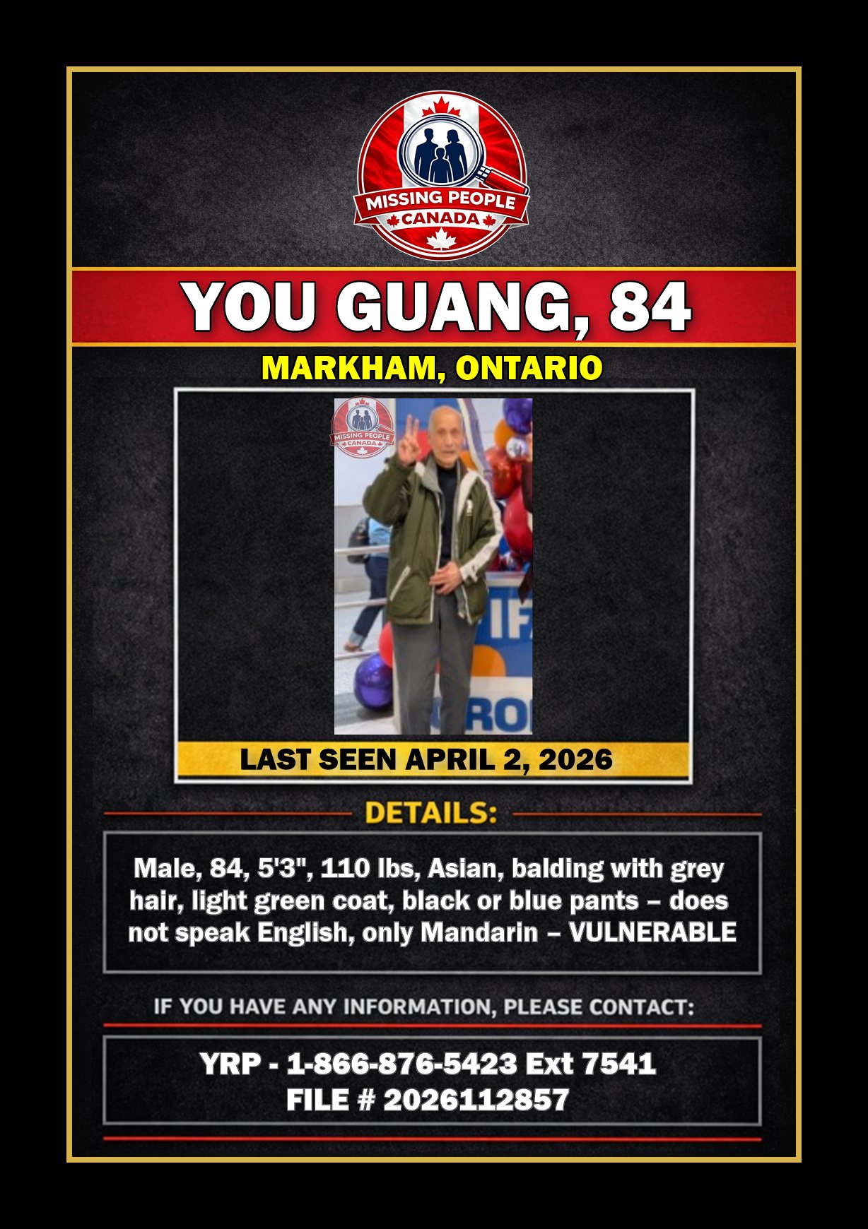 You Guang was last seen on Thursday, April 2, 2026 at 8 p.m. at his residence in the area of McCowan Rd / Dennison St, Markham, on foot.