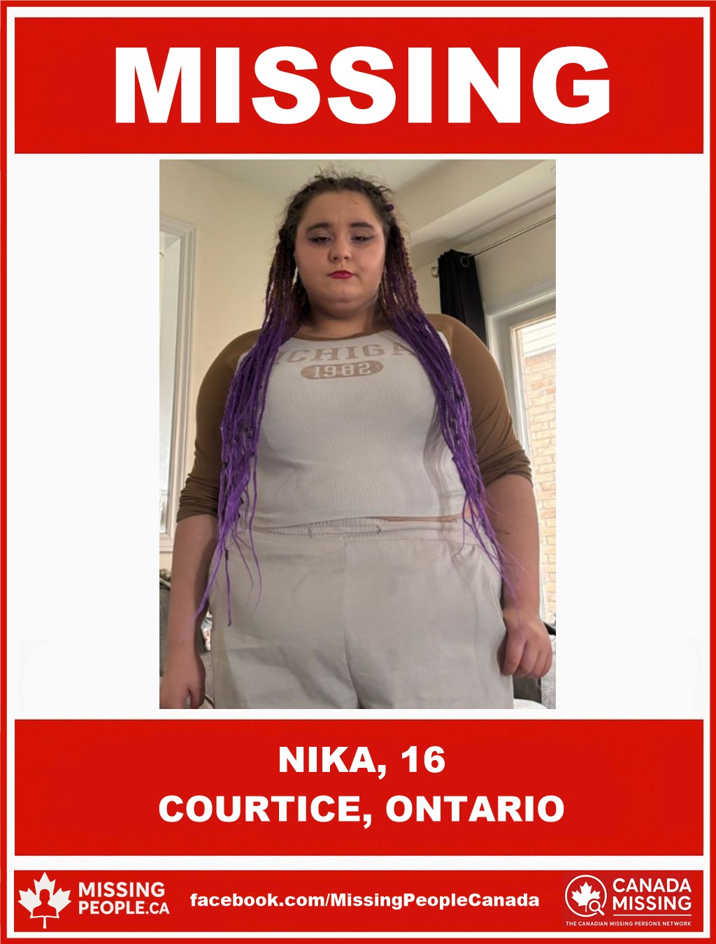 The Durham Regional Police Service is requesting the public’s assistance in locating 16-year-old Nika, who has been reported missing and is considered vulnerable. Police and family members are concerned for her wellbeing and safety.