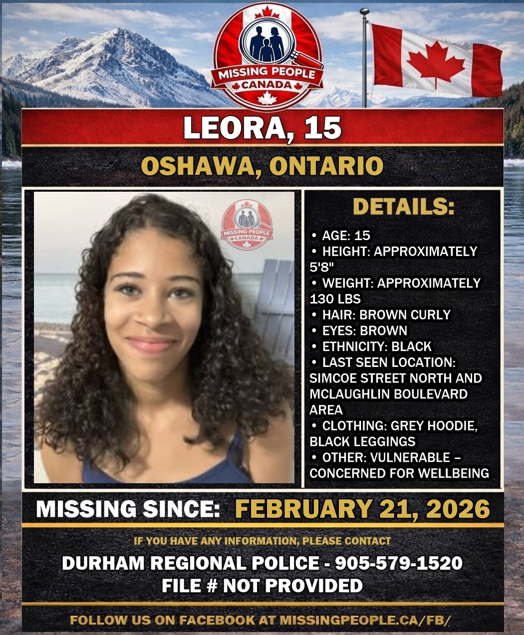 🚨 Missing vulnerable youth in Oshawa, Ontario – Leora, 15 – Last Seen February 21 2026