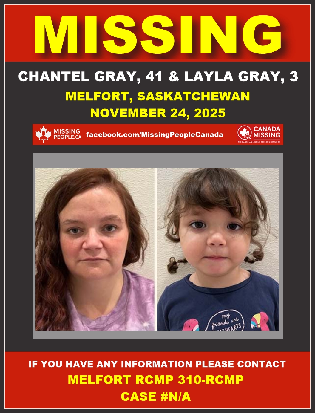 🚨 Missing Woman and Child in Melfort, Saskatchewan – Chantel Gray, 41 & Layla Gray, 3 – Last Seen November 24 2025