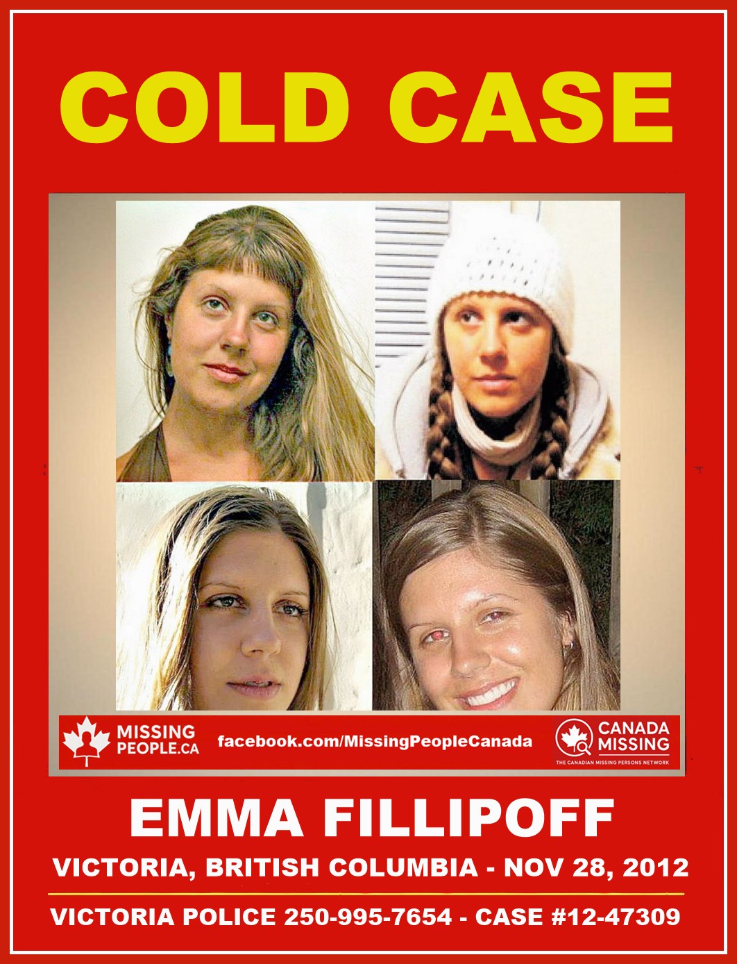 Emma Fillipoff was last seen on the evening of November 28, 2012, near the Empress Hotel in Victoria, British Columbia. She was observed exhibiting erratic behavior and emotional distress just hours before she disappeared.