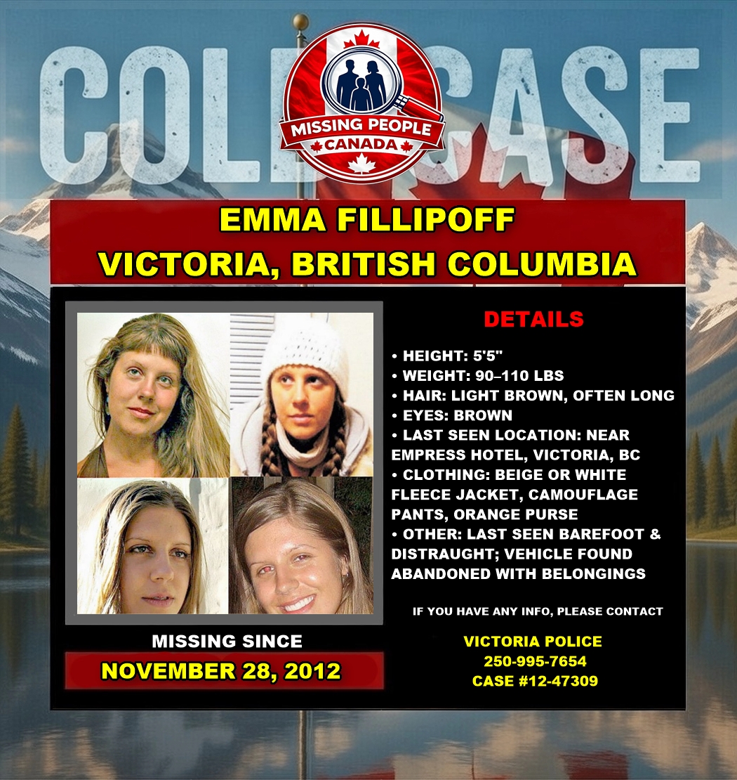 Emma Fillipoff was last seen on the evening of November 28, 2012, near the Empress Hotel in Victoria, British Columbia. She was observed exhibiting erratic behavior and emotional distress just hours before she disappeared.
