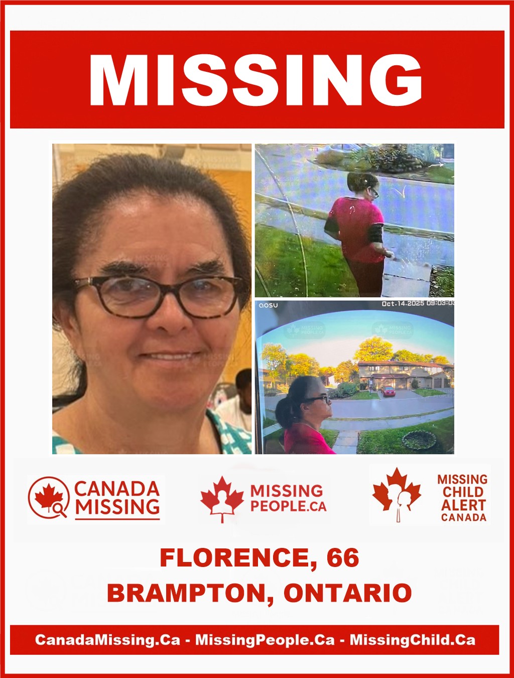 The Peel Regional Police are requesting the public’s assistance in locating 66-year-old Florence, a vulnerable person who was last seen travelling westbound on Hansen Road in Brampton at approximately 9:02 a.m. on October 14, 2025.