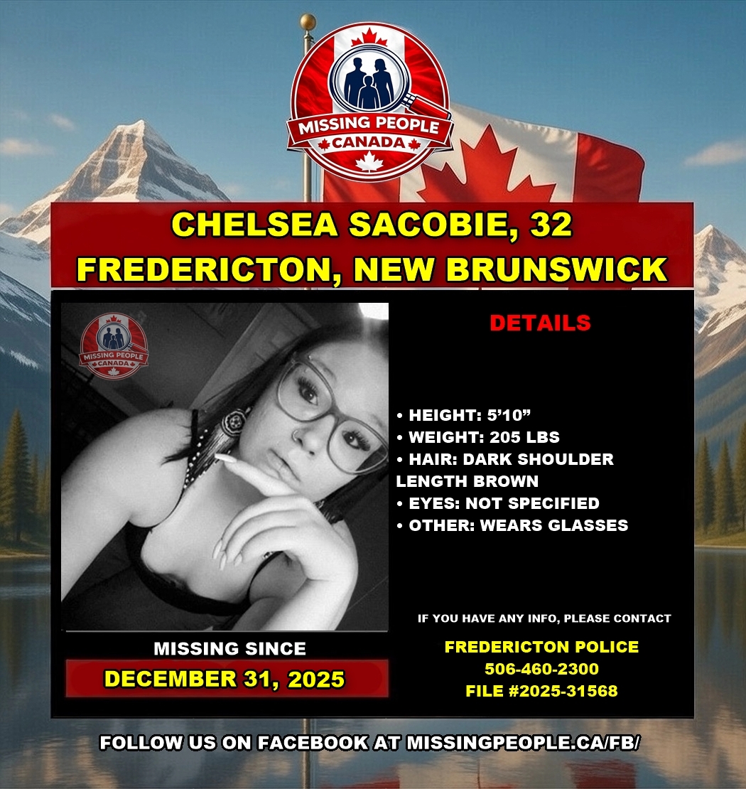 Le Service de police de Fredericton demande l’aide du public pour localiser une femme de 32 ans disparue, Chelsea Sacobie. Chelsea a été vue pour la dernière fois le 31 décembre 2025. La police est préoccupée pour son bien-être.