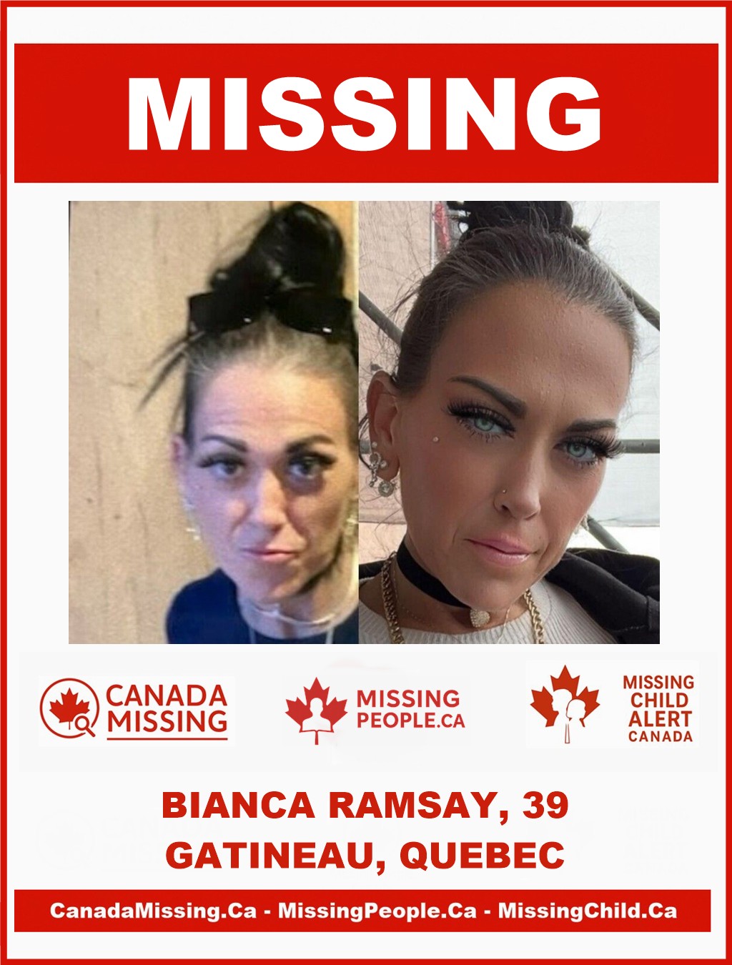 Police in Gatineau are asking for the public’s assistance in locating 39-year-old Bianca Ramsay, who has been missing since October 10, 2025. She was last seen leaving a residence on St-Jean Street in Gatineau on foot, and both police and family members have reason to fear for her health and safety.