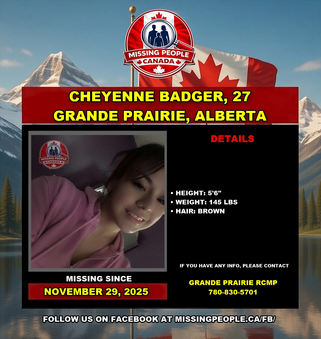 The Grande Prairie RCMP Detachment is seeking the public’s assistance in locating a missing 27-year-old woman, Cheyenne Badger. Cheyenne was last seen on November 29, 2025. Police are concerned for her wellbeing.