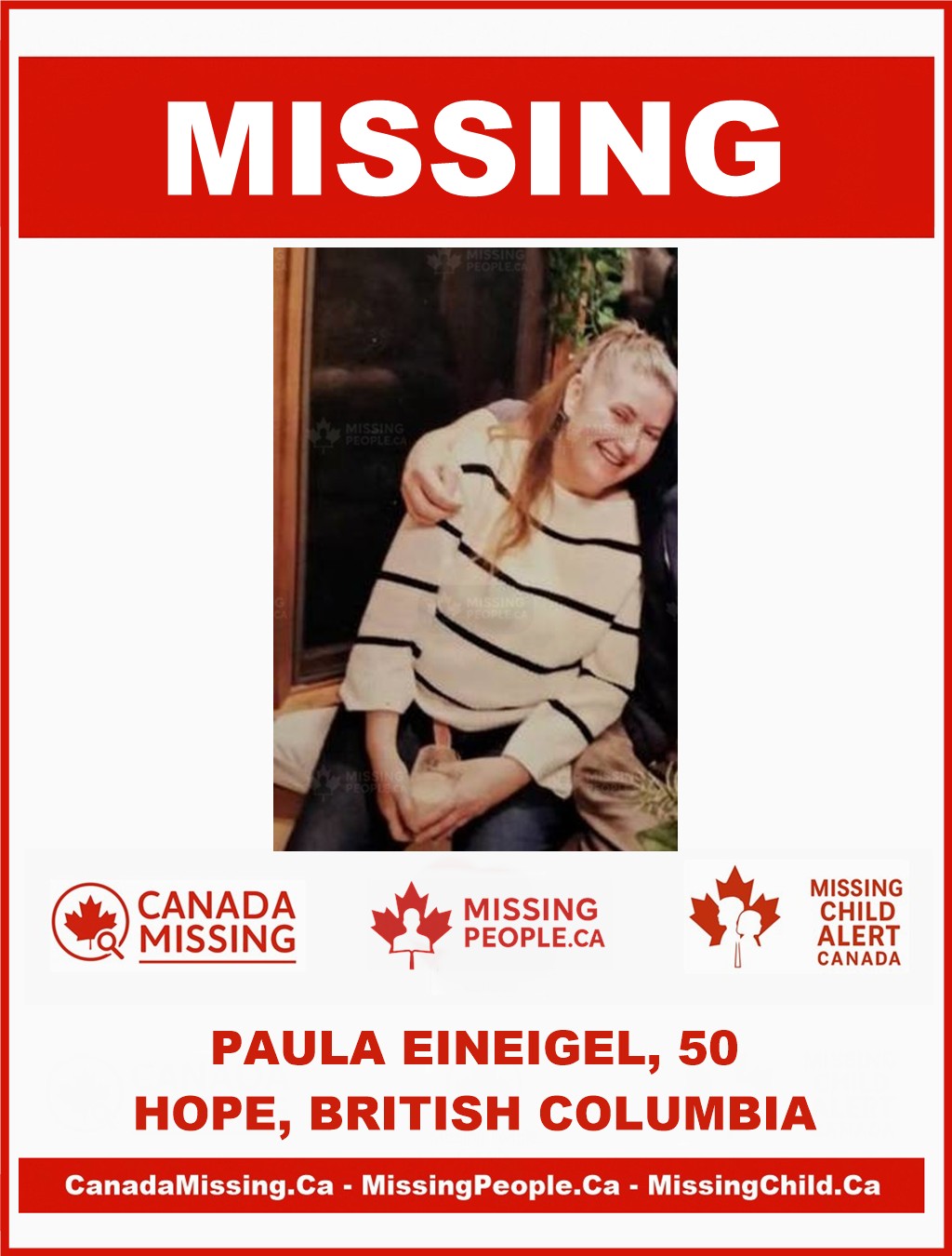 The RCMP are asking for the public’s assistance in locating 50-year-old Paula Eineigel of Vancouver, who was last seen on October 4, 2025, in Hope, British Columbia.