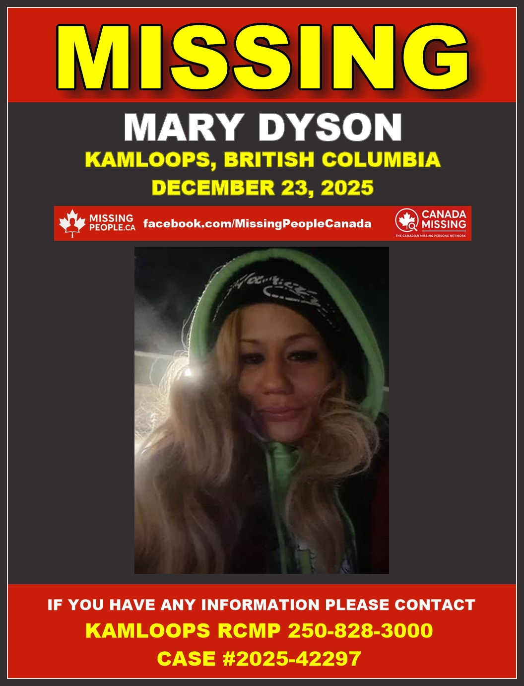 If you have seen Mary or have information about her whereabouts, you are asked to contact the Kamloops RCMP Detachment at 250-828-3000 and cite file 2025-42297. Anonymous tips can be submitted to Crime Stoppers at 1-800-222-8477.