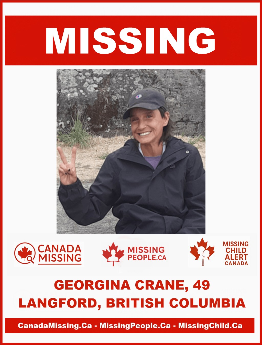 The West Shore RCMP is seeking public assistance in locating Georgina Crane, a 49-year-old woman who was reported missing on October 19, 2025. She was last seen the same day in the Langford, BC area.