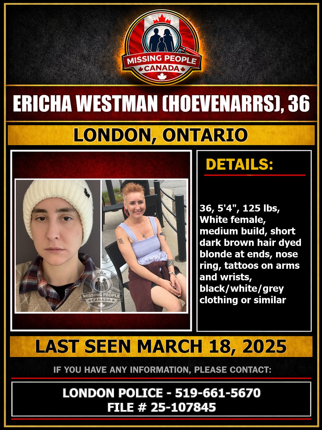 🚨 MISSING WOMAN IN LONDON, ONTARIO – ERICHA WESTMAN (HOEVENARRS), 36 – LAST SEEN MARCH 18, 2025
