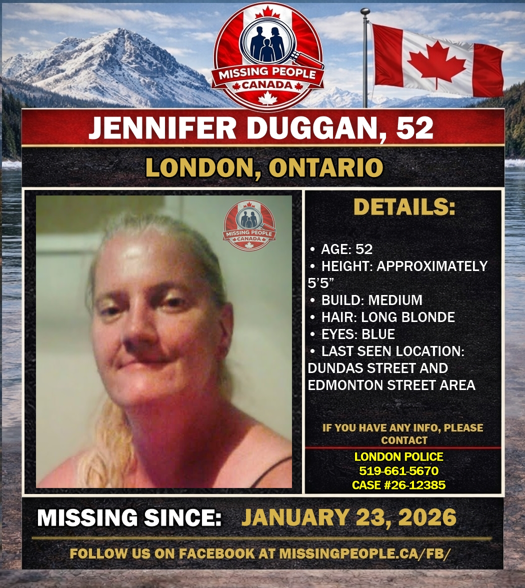 The London Police Service is requesting the public’s assistance in locating a missing 52-year-old woman, Jennifer Duggan, of London. Jennifer was last seen on January 23, 2026, in the area of Dundas Street and Edmonton Street. She was reported missing on February 7, 2026. Police and family are concerned for her welfare.