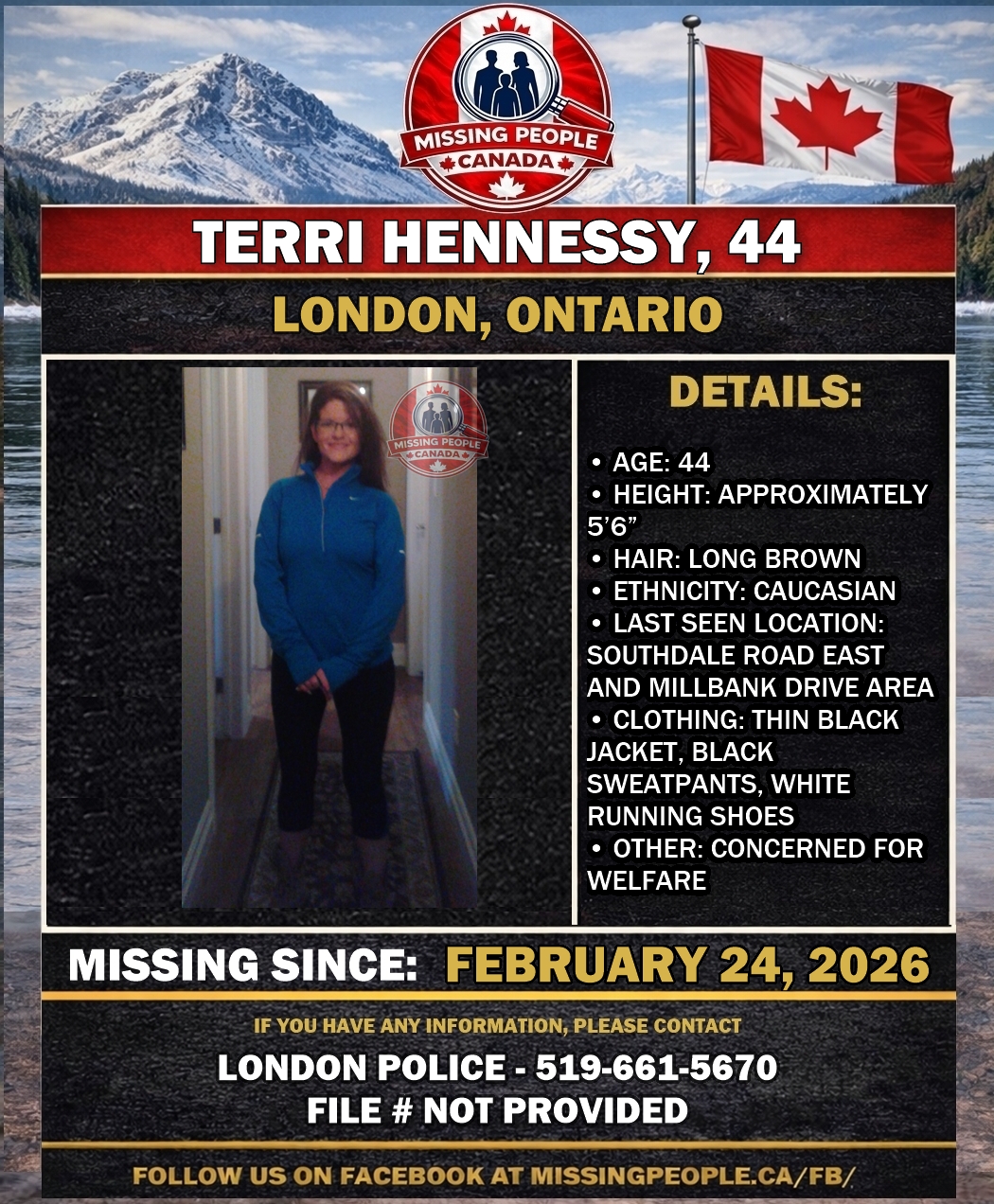 The London Police Service is requesting the public’s assistance in locating a missing 44-year-old woman, Terri Hennessy, of London. Terri was last seen on February 24, 2026 at approximately 9:00 p.m. in the area of Southdale Road East and Millbank Drive. She was reported missing by her family on February 25, 2026. Police and family are concerned for her welfare.