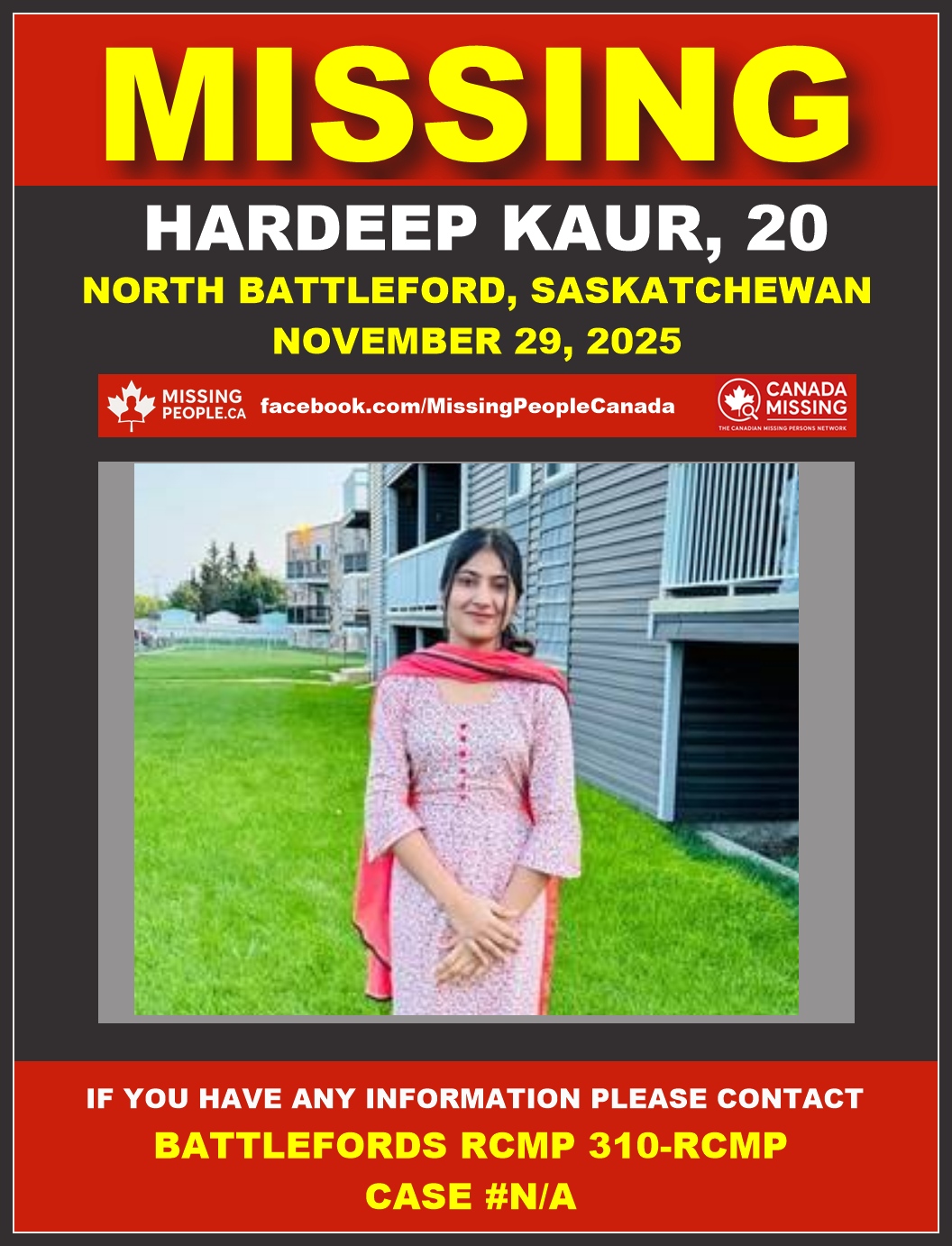 🚨 Missing Woman in North Battleford, Saskatchewan – Hardeep Kaur, 20 – Last Seen November 29, 2025