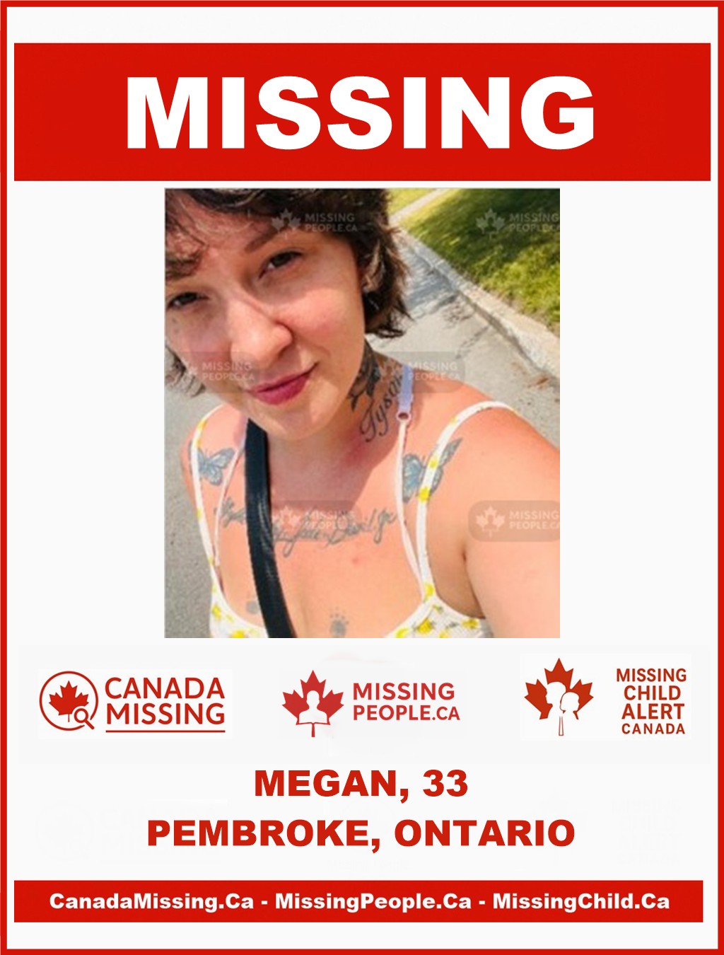The Ontario Provincial Police (UOVOPP) are seeking public assistance in locating Megan, a 33-year-old woman who was last seen on Friday, September 5, 2025, at approximately 3:00 p.m. in the area of Pembroke Street East and MacKay Street in Pembroke, Ontario.