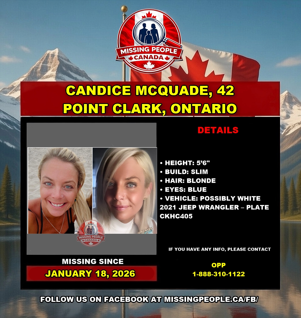 The South Bruce OPP is asking for the public’s assistance in locating a missing 42-year-old woman, Candice McQuade, from Point Clark. Candice was last seen on January 18, 2026, around 6 p.m.. Police are concerned for her well-being.