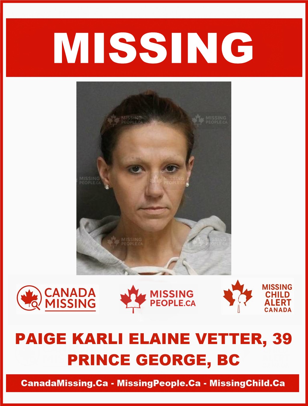 The Prince George RCMP is requesting the public’s assistance in locating Paige Karli Elaine Vetter, age 39. She was last seen near the 6500-block of Southridge Avenue at the beginning of September and has not been heard from since.
