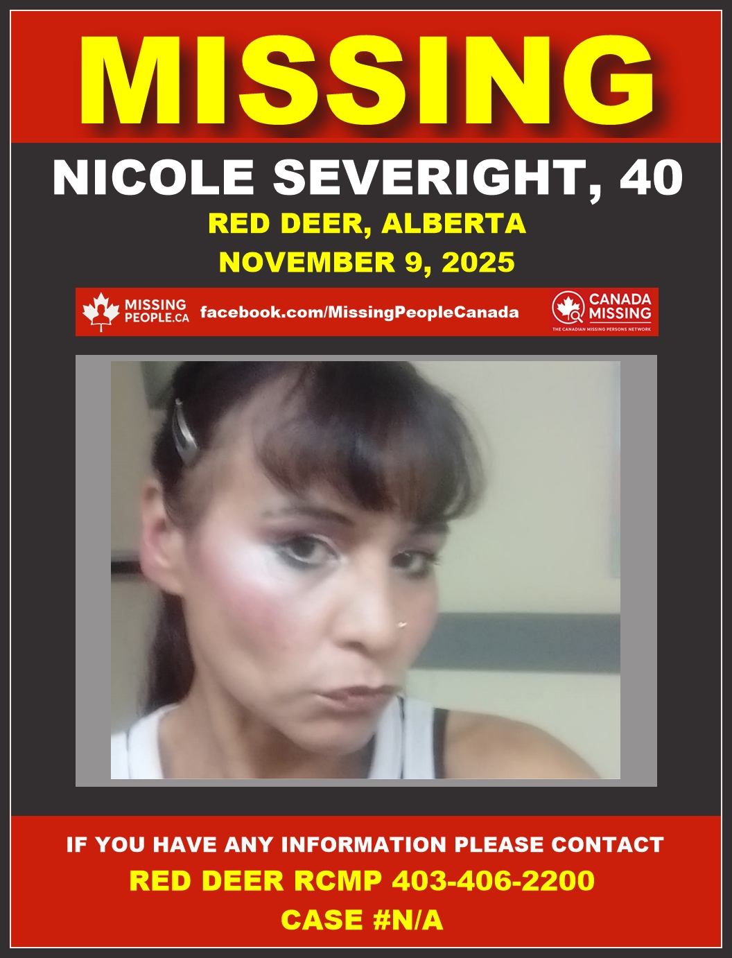 🚨 Missing Woman in Red Deer, Alberta – Nicole Severight, 40 – Last Seen November 9, 2025