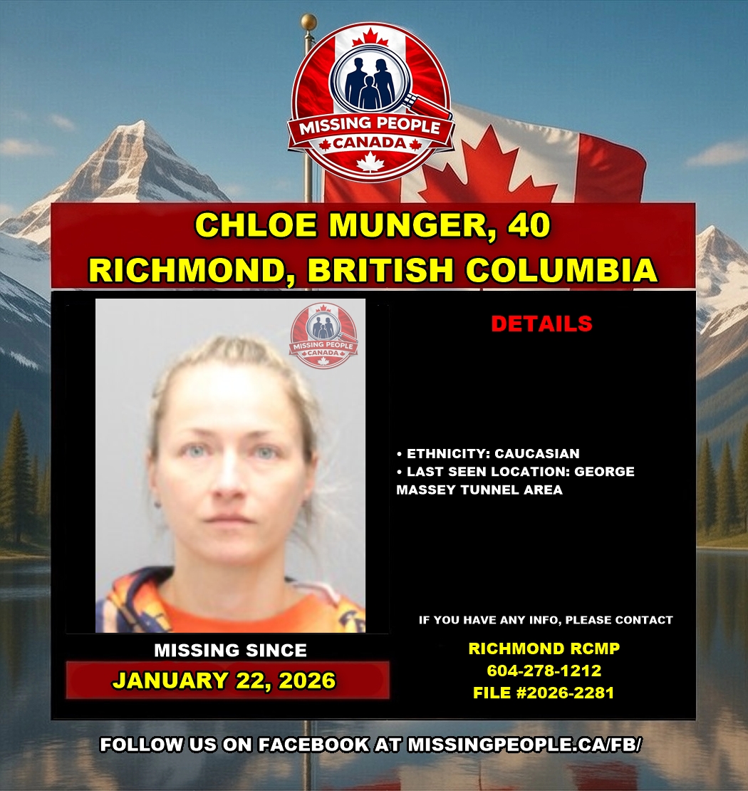 The Richmond RCMP is requesting the public’s assistance in locating a missing approximately 40-year-old woman, Chloe Munger. Chloe was last seen in the early morning hours of January 22, 2026, in the area of the George Massey Tunnel in Richmond. Police are concerned for her wellbeing.