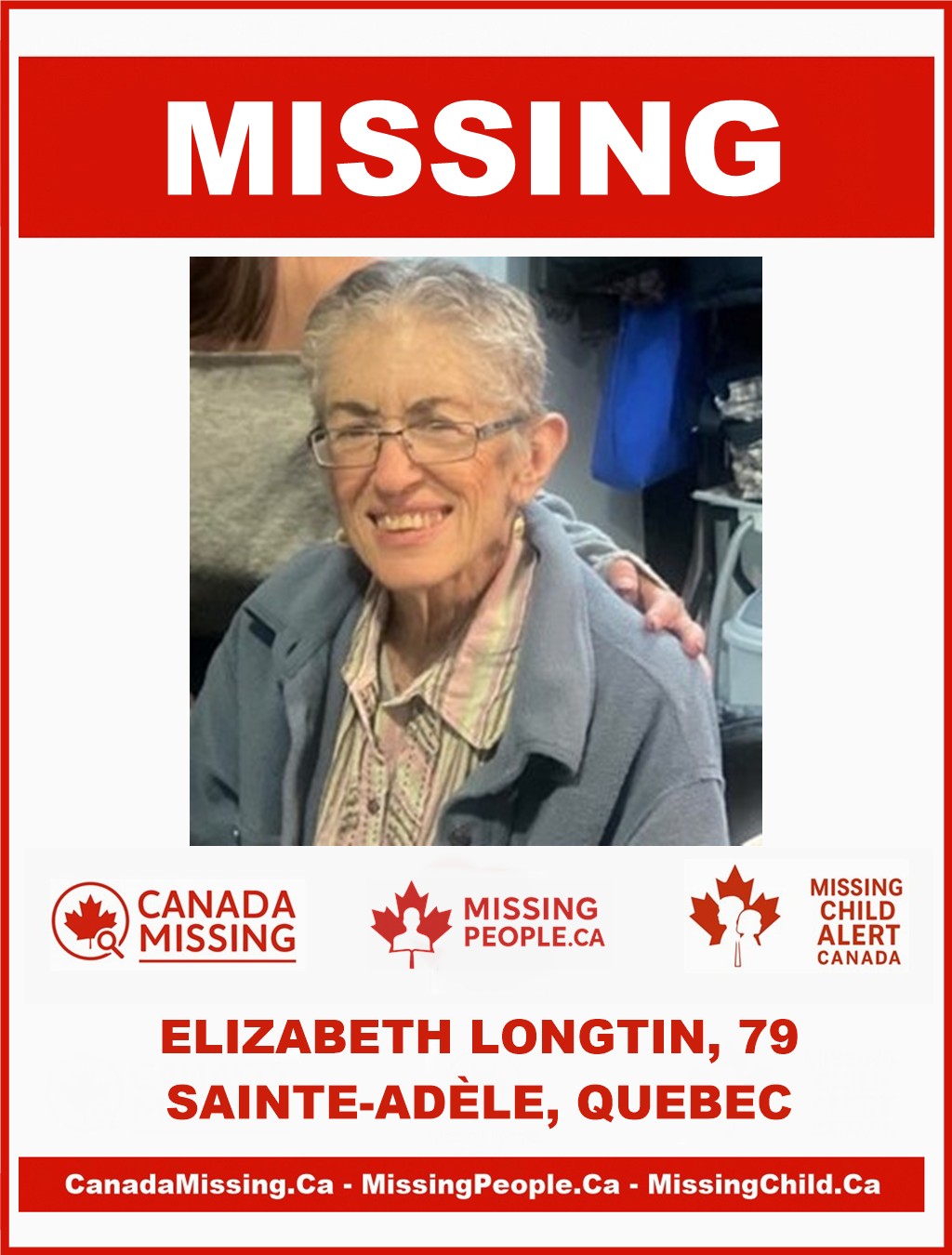 The Sûreté du Québec is asking for the public’s assistance in locating Elizabeth Longtin, a 79-year-old woman from Sainte-Adèle. She was last seen on October 18, 2025, in the area of rue Saint-Joseph. Her family last heard from her the following morning, on October 19, by phone.
