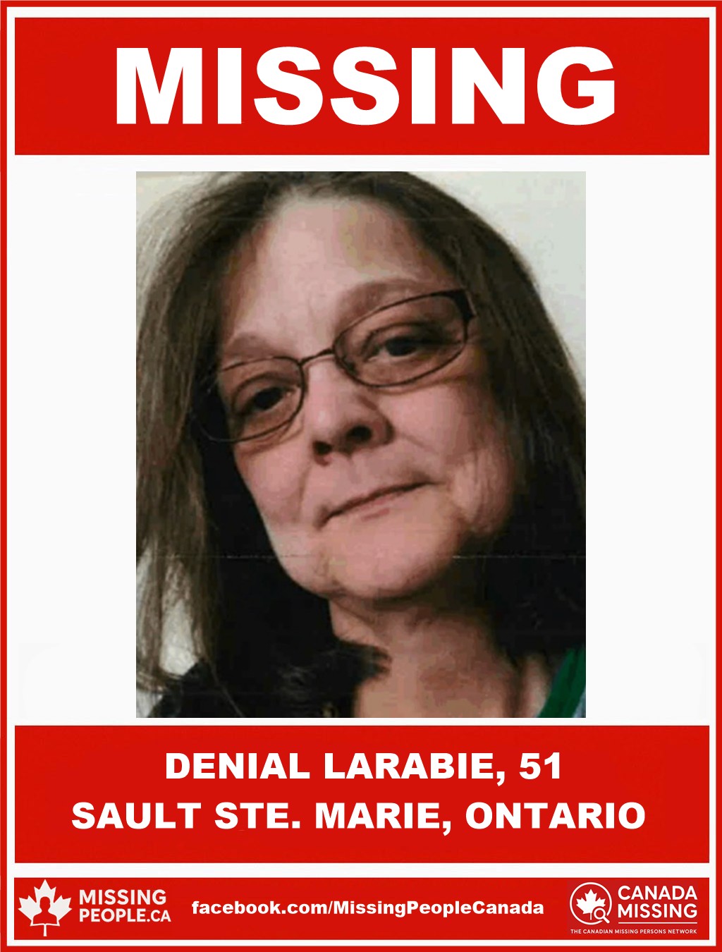 The Sault Ste. Marie Police Service is requesting the public’s assistance in locating 51-year-old Denial (pronounced “Danielle”) Larabie, who was last seen on September 11, 2025.