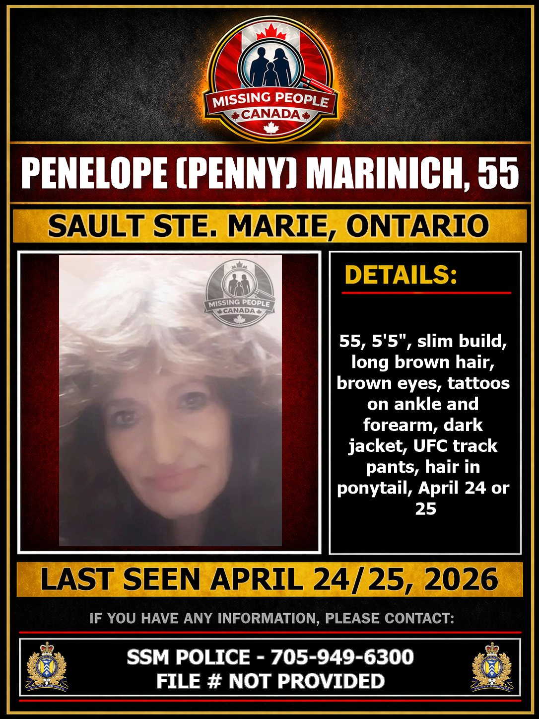 MISSING WOMAN IN SAULT STE. MARIE, ONTARIO – PENELOPE (PENNY) MARINICH, 55 – LAST SEEN APRIL 24 OR 25, 2026