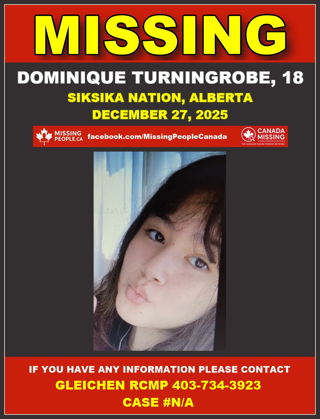 The Gleichen RCMP are asking for help finding a missing 18-year-old woman, Dominique Turningrobe. Dominique was last seen on December 27, 2025, in Siksika Nation. Police are concerned for her wellbeing.