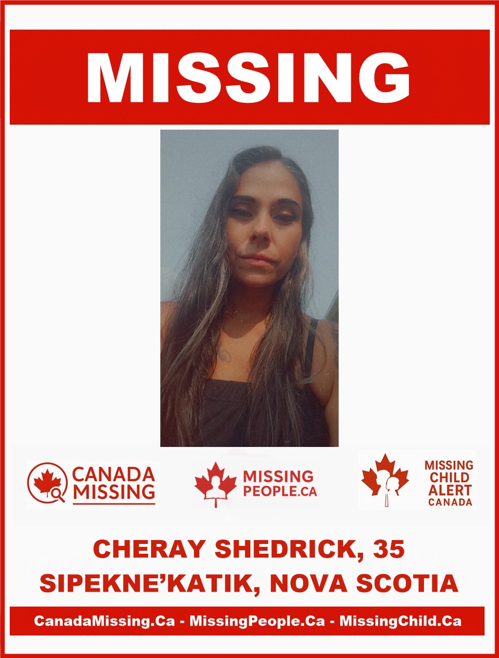 The Sipekne’katik RCMP is asking for the public’s assistance in locating 35-year-old Cheray Shedrick, who was last seen on October 10, 2025, in Sipekne’katik, Nova Scotia.