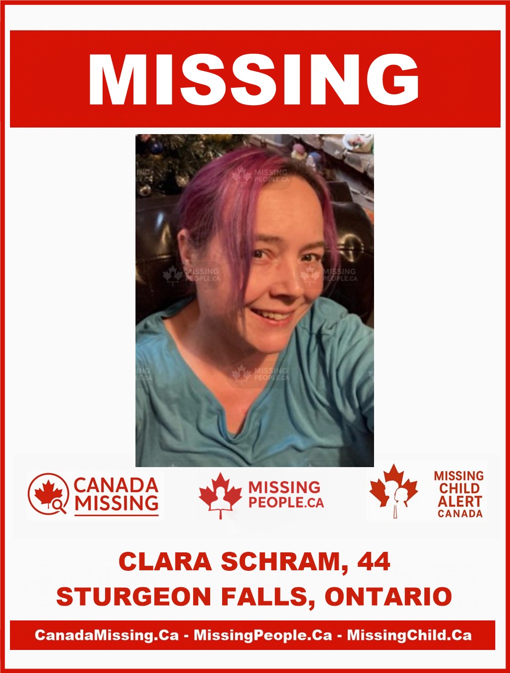 The Ontario Provincial Police (OPP) are asking for the public’s assistance in locating 44-year-old Clara Schram. She was last seen on Saturday, October 11, 2025, at approximately 7:00 a.m. on Second Street in Sturgeon Falls.