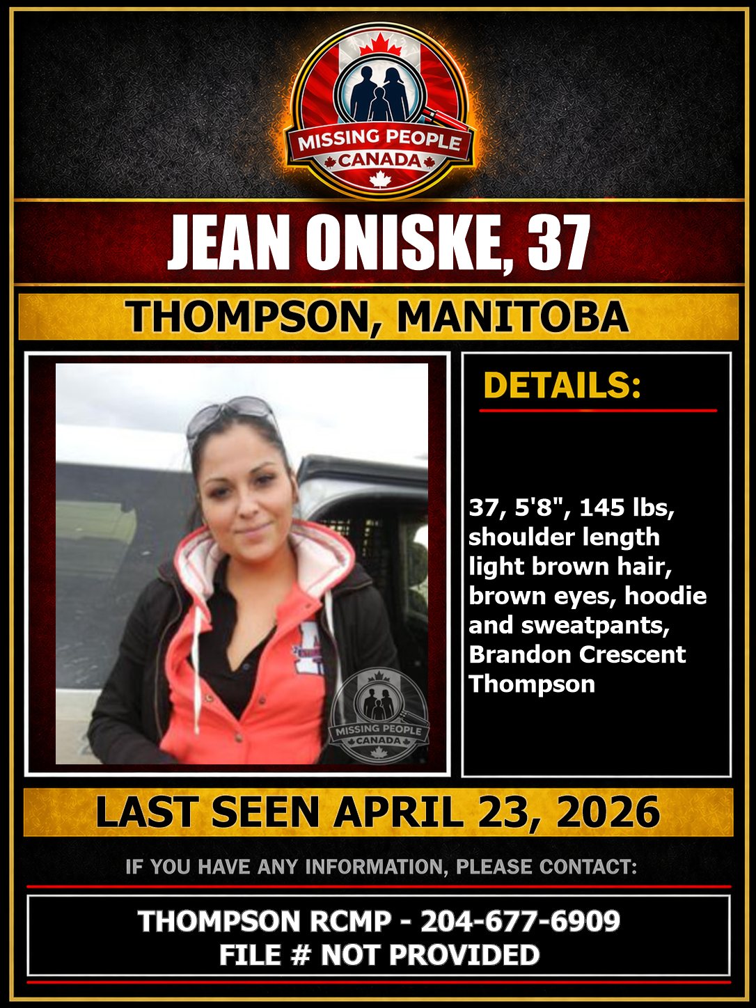 MISSING WOMAN IN THOMPSON, MANITOBA – JEAN ONISKE, 37 – LAST CONTACT APRIL 23, 2026