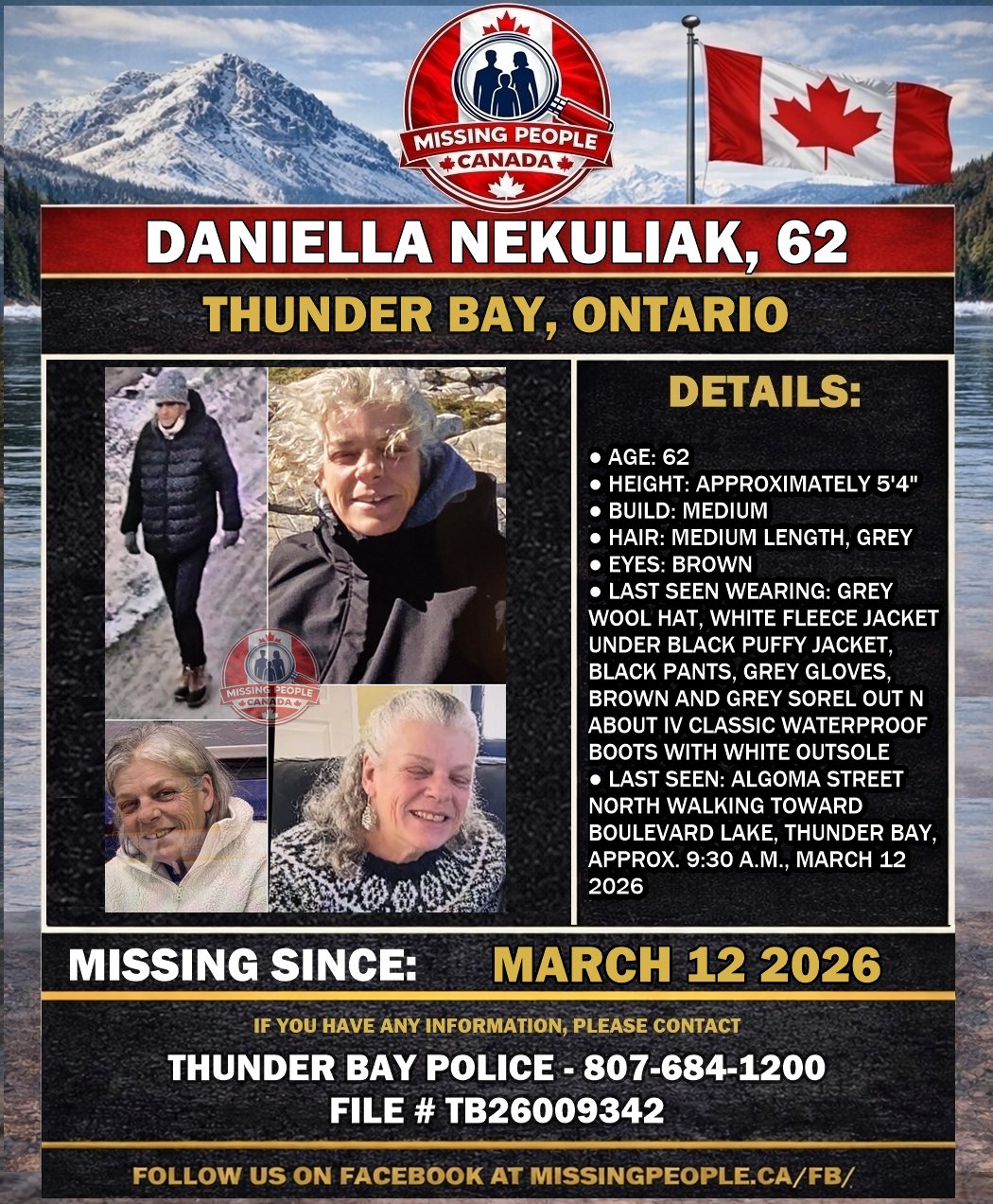 🚨 Missing Person in Thunder Bay, Ontario – Daniella Nekuliak, 62 – Last Seen March 12 2026