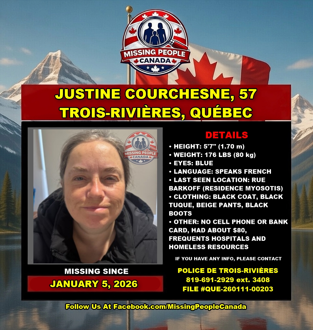 The Service de police de la Ville de Québec (SPVQ) is requesting the public’s assistance in locating a missing 57-year-old woman, Justine Courchesne. Justine was last seen on January 5, 2026, leaving the Myosotis residence at 600, rue Barkoff in Trois-Rivières. She travels on foot, has no cell phone or bank card, and had approximately $80 with her. Police are concerned for her health and safety.