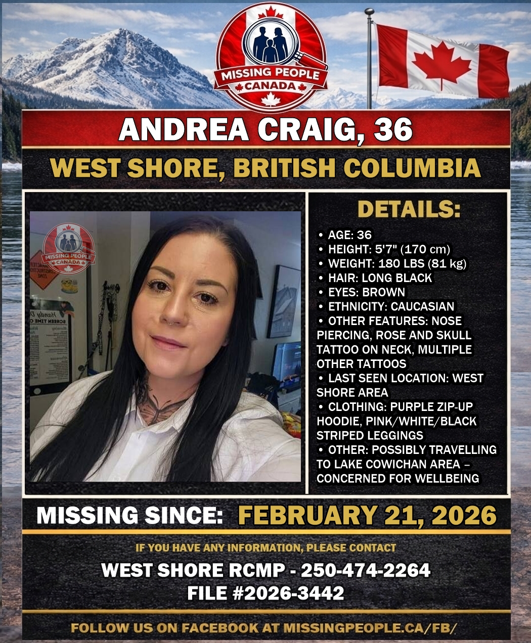 Anyone with information on Andrea Craig’s whereabouts is urged to contact West Shore RCMP at 250-474-2264, their local police, or Crime Stoppers anonymously at 1-800-222-8477.