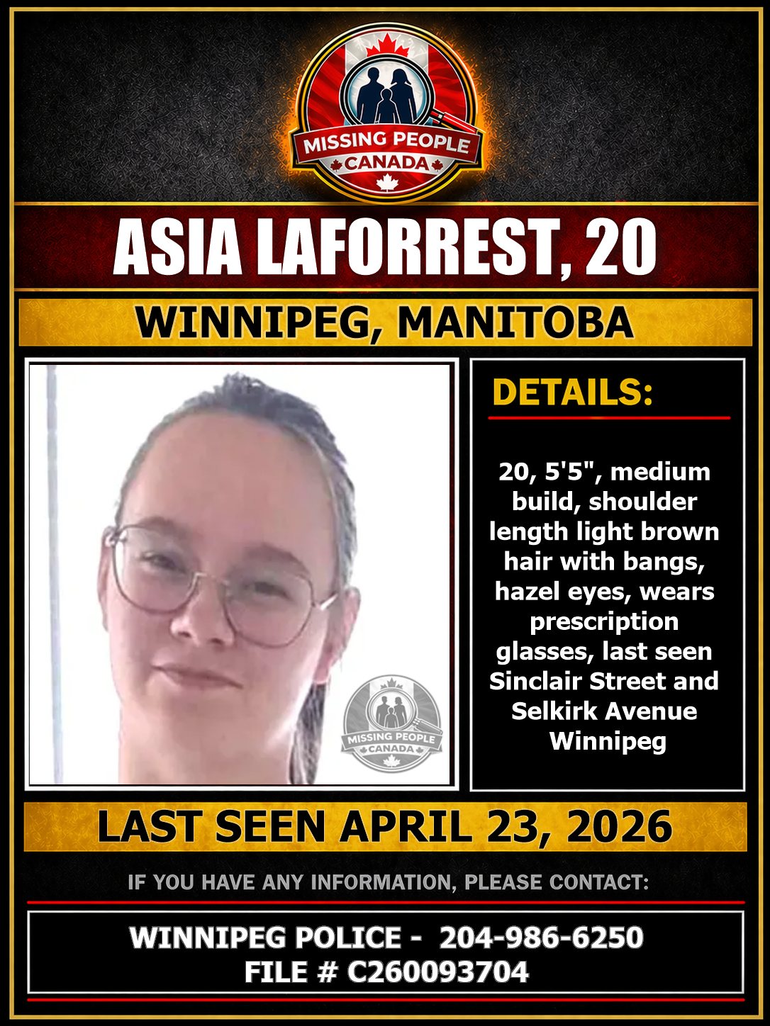 20-year-old woman Asia LaForrest missing from Winnipeg, Manitoba – last seen April 23, 2026 near Sinclair Street and Selkirk Avenue