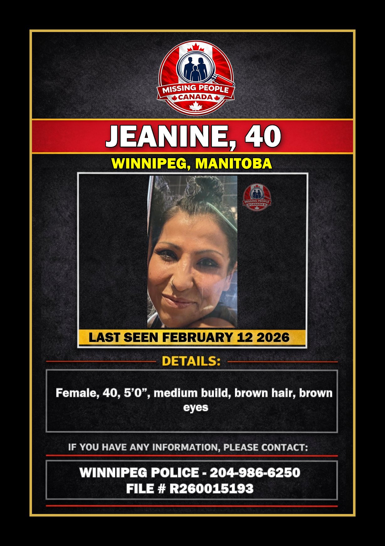 🚨 Missing woman in Winnipeg – Jeanine, 40 – Last Seen February 12 2026