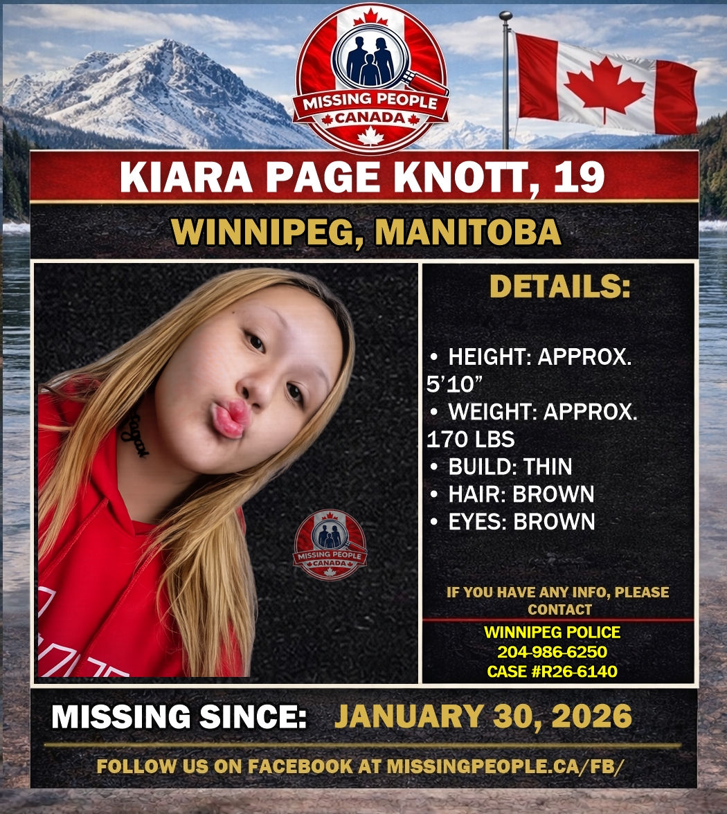 🚨 Missing Woman in Winnipeg, Manitoba – Kiara Page Knott, 19 – Last Seen January 30, 2026