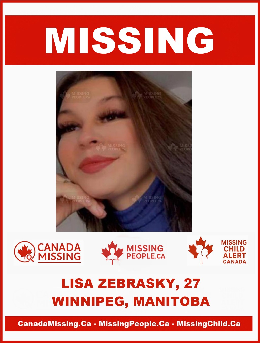 If you have any information on the whereabouts of Lisa Zebrasky, please contact the Winnipeg Police Service Missing Persons Unit at 204-986-6250.