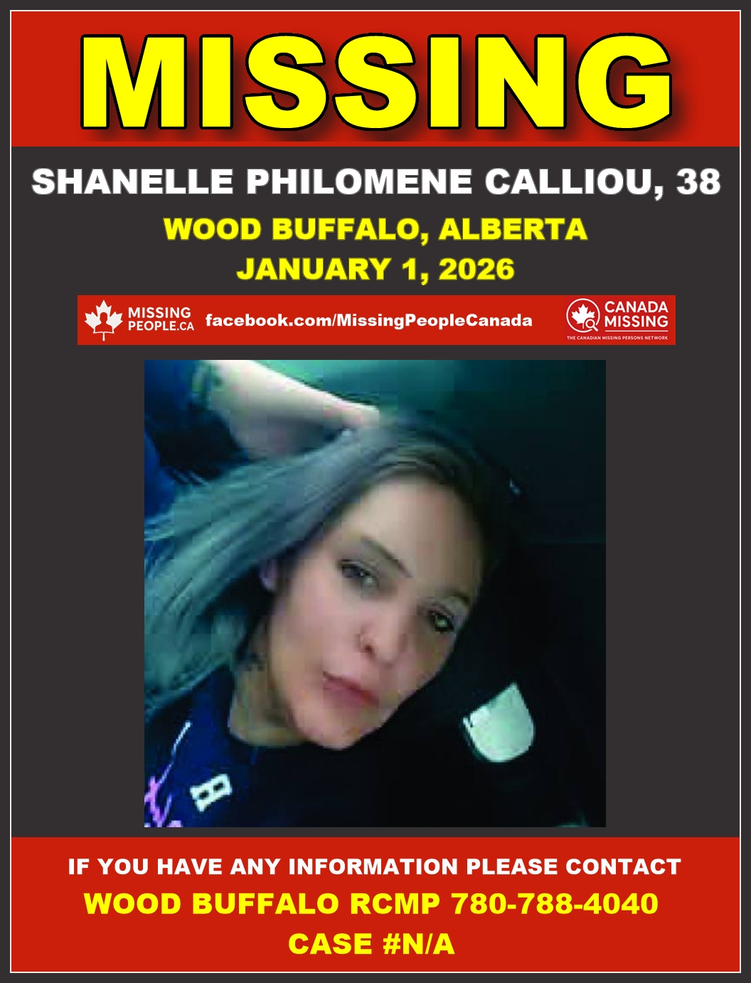 The Wood Buffalo RCMP is seeking the public’s assistance in locating a missing woman, Shanelle Philomene Calliou, 38. She was last seen on January 1, 2026, in Fort McMurray. Police are concerned for her safety.