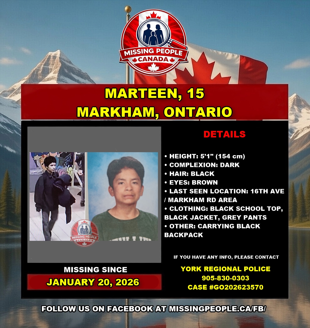The York Regional Police is requesting the public’s assistance in locating a missing 15-year-old youth, Marteen. Marteen was last seen during the afternoon of January 20, 2026, in the 16th Ave/Markham Rd area. Police are concerned for his wellbeing.