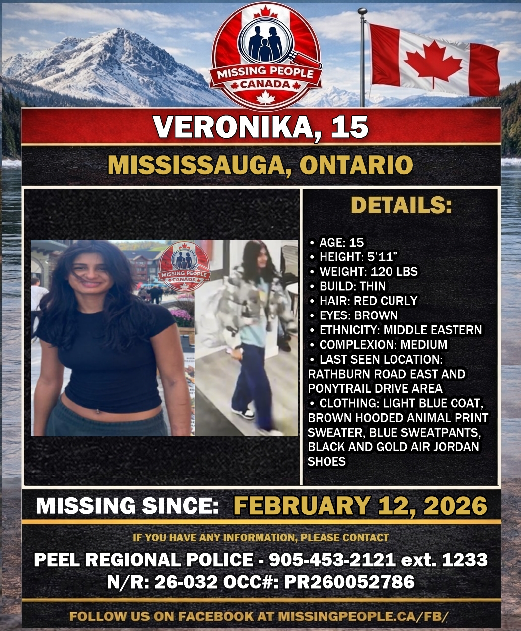 The Peel Regional Police are requesting the public’s assistance in locating a missing 15-year-old youth, Veronika. Veronika was last seen on Thursday, February 12, 2026 at approximately 4:55 p.m. at a residence near Rathburn Road East and Ponytrail Drive in Mississauga. Police and family are concerned for her well-being.