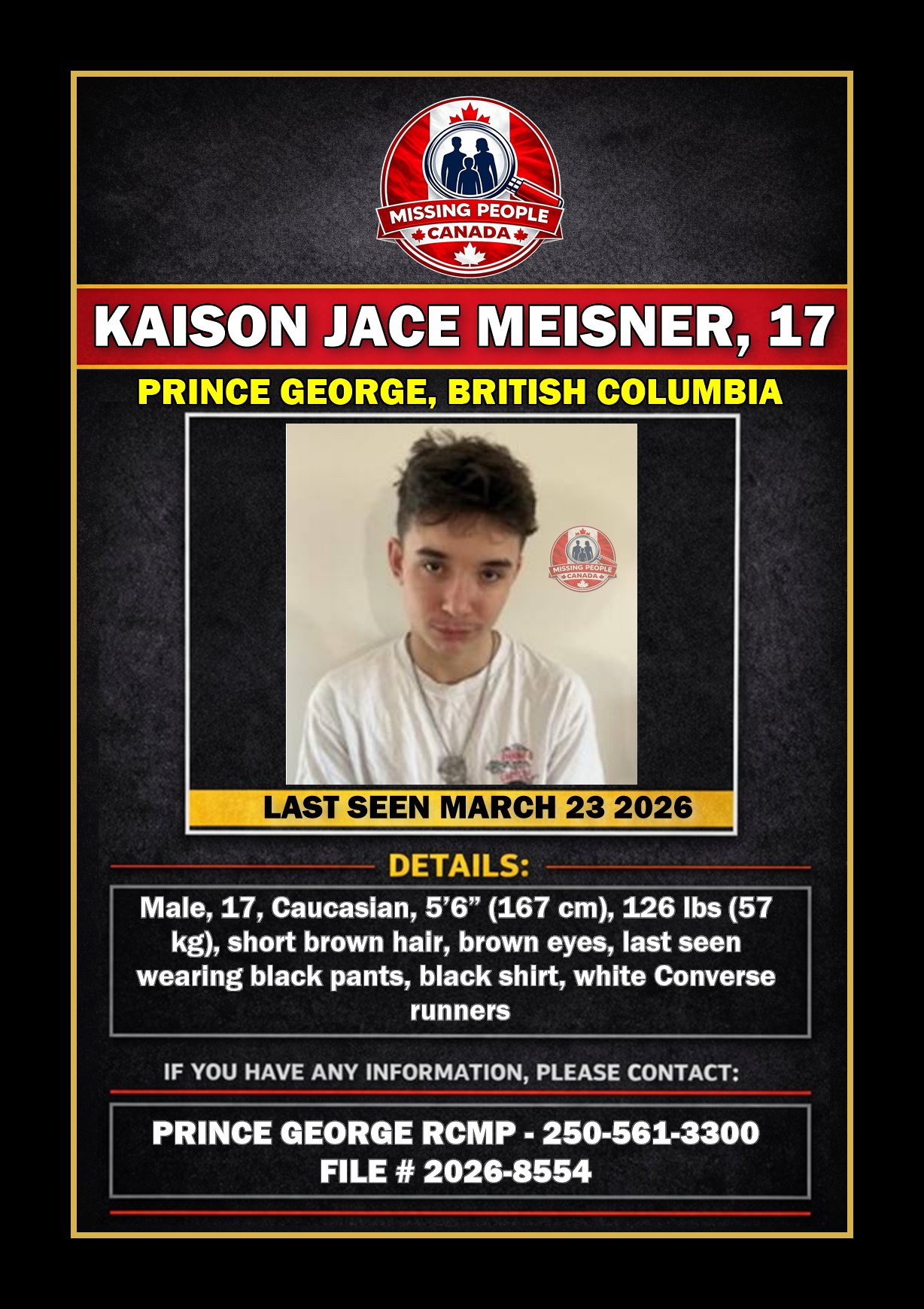 MISSING YOUTH IN PRINCE GEORGE, BRITISH COLUMBIA – KAISON JACE MEISNER, 17 – LAST SEEN MARCH 23 2026