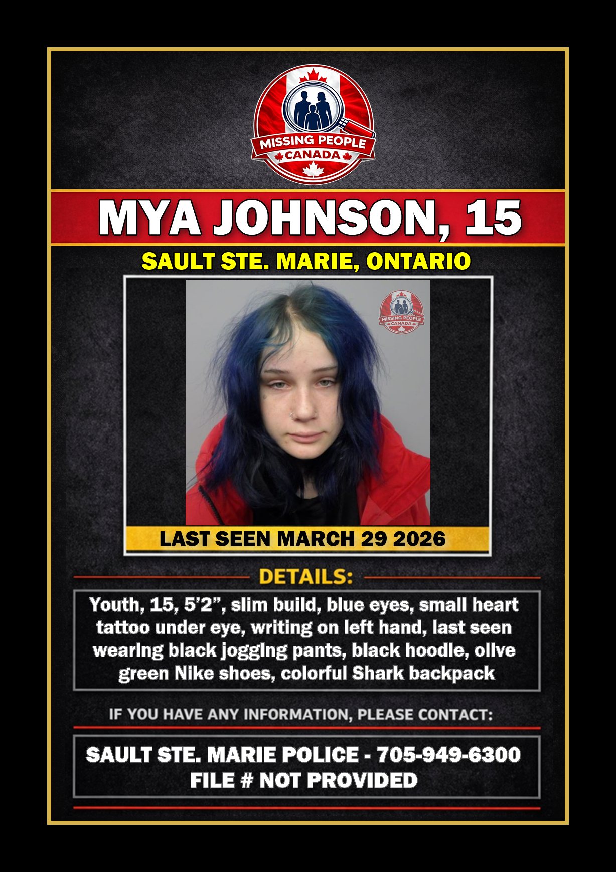 🚨 Missing youth in Sault Ste. Marie – Mya Johnson, 15 – Last Seen March 29 2026