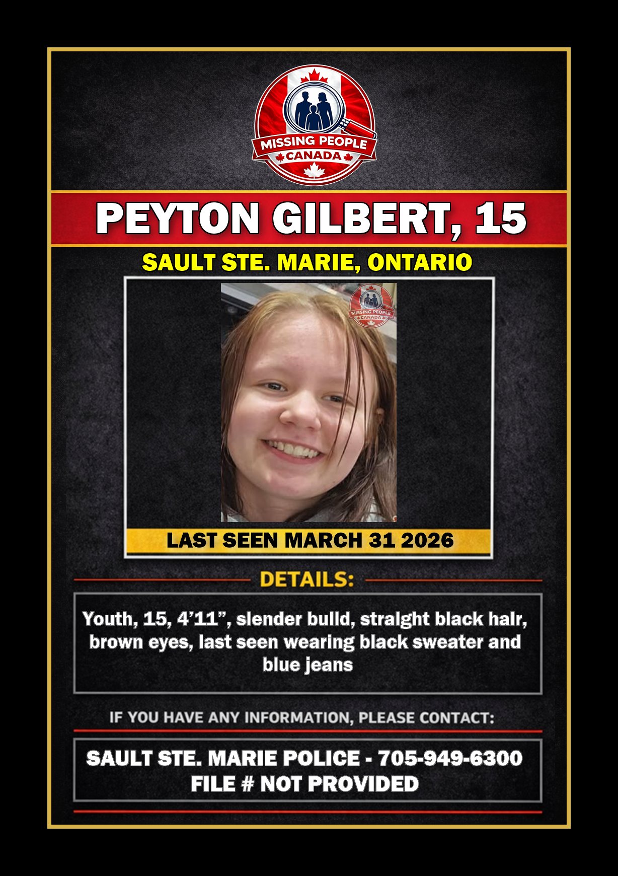 🚨 Missing youth in Sault Ste. Marie – Peyton Gilbert, 15 – Last Seen March 31 2026