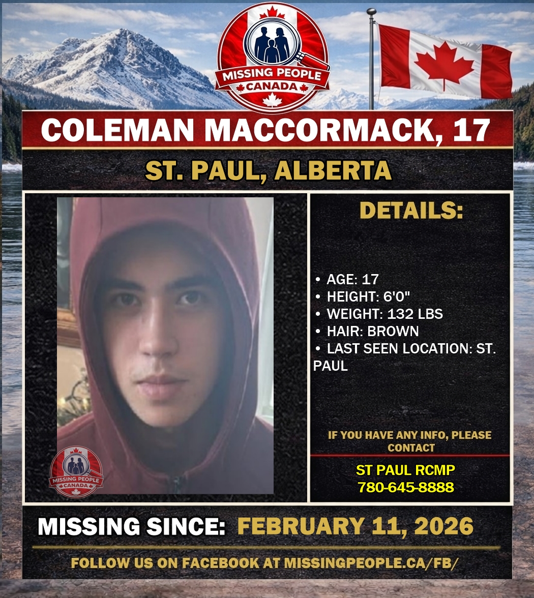 The St. Paul RCMP Detachment is seeking the public’s assistance in locating a missing 17-year-old youth, Coleman Maccormack. Coleman was last seen on February 11, 2026, in St. Paul. Police are concerned for his wellbeing.