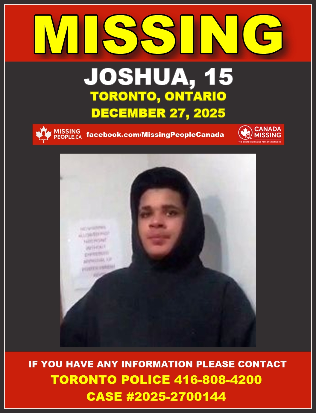 The Toronto Police Service is requesting the public’s assistance locating a missing youth, Joshua, 15. Joshua was last seen on Saturday, December 27, 2025, at 9:30 p.m., in the Midland Avenue and Sheppard Avenue East area. Police are concerned for their safety.